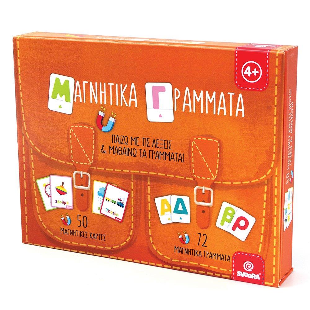 Μαγνητικό Σετ γραμμάτων και εικόνων από την ελληνική εταιρία Svoora. Τα παιδιά, με τις μαγνητικές κάρτες πρώτης γραφής και ανάγνωσης, αποκτούν την πρώτη επαφή τους με τα γράμματα της ελληνικής αλφαβήτου! Η ταύτιση της εικόνας με τη λέξη ενισχύει την κατανόηση των εννοιών και την αναγνώριση των πεζών και κεφαλαίων χαρακτήρων. Οι τόνοι βοηθούν στην εκμάθηση της ορθογραφίας και της ανάγνωσης. Ο πίνακας και τα γράμματα περιέχουν γραμμές που καθοδηγούν το παιδί στη σωστή γραφή πάνω σε αυτές. Ο πιο δημιουργικός τρόπος για την εξάσκηση της παρατηρητικότητας και το συντονισμό χεριού-ματιού. Η ιδιαίτερη συσκευασία – τσάντα περιλαμβάνει 50 μαγνητικές κάρτες διπλής όψης, 24 κεφαλαία και 48 πεζά μαγνητικά γράμματα υψηλής ανθεκτικότητας, 7 τόνους, ένα μαγνητικό πίνακα με γραμμές και ένα μαρκαδόρο «γράψε – σβήσε» με σφουγγάρι. Κατάλληλο άνω των 3 ετών.